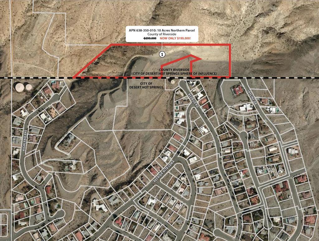 ONLY ONE PARCEL REMAINS AT $199k for 10 PRIME ACRES! Trophy Land Parcel in the higher elevated and more affluent area of Desert Hot Springs with $1M+ homes in the immediate area. Within the Unincorporated County of Riverside & ''Desert Hot Springs Sphere of Influence''. The General Plan Use is OS-CH and within the MSHCP area (Buyer to Verify), and zoning is W-2 which can potentially allow 20,000 sq. min. lots (Buyer to Verify). The subject site is perched high above the valley floor with views of the West Coachella Valley and Mt. San Jacinto, unlike any other in the desert area. This scenic property also offers an abundance of hiking and biking opportunities being adjacent to the foothills of Joshua Tree National park. Potential Hot Springs Mineral Water below pad, but not verified. *Buyer to verify potential uses.