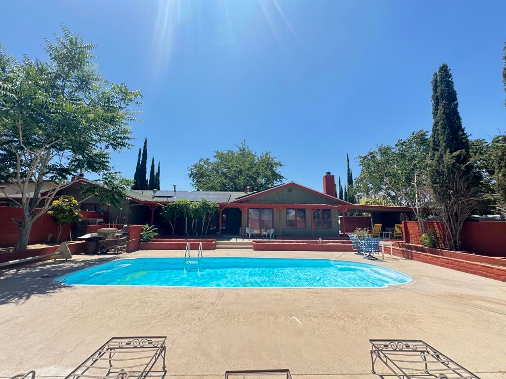 This hidden gem, centrally located in Yucca Valley, is a peaceful place to relax in the desert. This 3 bed/3 Bath home has 2,028 SqFt and sits on a lot size that is approximately 18,600 SqFt, mostly enclosed by a block wall and an electrical gate to allow easy access to the driveway where you can park about 4 cars, as well as an RV parking area in the back. This precious home features a sparkling private pool surrounded by a spacious cool decking area for summer days, and 3 cozy fireplaces in different spots of the house for winter days. Both are perfect for a family gathering or for parties. This home is well-kept, keeping the unique essence of 1967. The main bedroom has its own fireplace, bathroom, and walk-in closet. The living room has majestic views of the front yard, which showcases an enchanting tree that provides shade throughout the summer and invites the sun back in the winter, not to mention this view being framed by mountains. The family area overlooks the pool as well as the dining room and kitchen. In the dining room, the French doors open up to the back patio and pool area. The retro kitchen is equipped with stainless steel ovens, a gas stove, dishwasher and a refrigerator. The garage area is currently being used as a library and lounge. This charming home offers a few covered patios, an outside fireplace, an artsy and secluded side yard, and many other areas to relax in the roomy front yard. The house has had some upgrades: In 2005, they installed a new roof and evap cooler. In 2024, the chimney plate was replaced, one quarter of the C roof by the chimney was redone, and a new Pentar pump and chlorinator dispenser were also installed. In 2022, the solar system was installed. This home is close to restaurants, stores, and other town-life events like the Gubler Orchid festival. Additionally, it lies between the lush Palm Springs, Joshua Tree National Park, and neighboring cities. Come see this charming home and make it your own!