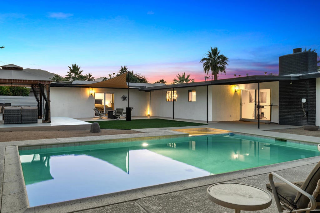 Perfectly positioned in the heart of South Palm Desert, this tastefully reimagined Mid-Century Modern residence offers a seamless blend of timeless architecture and contemporary upgrades. Set on a spacious 1/4-acre lot, the home showcases clean lines, vaulted ceilings, and an effortless indoor-outdoor flow--all set against a backdrop of mountain views and desert skies. Inside, the open-concept layout features soft-toned flooring, a sleek fireplace with a modern black surround, and a beautifully upgraded kitchen with new cabinetry, solid-surface countertops, and premium appliances. The home offers three bedrooms and two fully renovated baths, including a luxurious primary suite with direct pool access, a walk-in closet with custom storage, and a spa-inspired bath featuring a hydro-tub and oversized walk-in shower. Outside, the south-facing backyard is a private oasis with newly resurfaced pool and spa, fresh desert landscaping, updated pool equipment, and covered patio for al fresco entertaining. Whether you're envisioning a serene personal retreat or a versatile investment opportunity, the generous lot offers abundant space for expansion, vehicle storage, or the addition of an accessory dwelling unit--preliminary plans for which are included in the sale. Situated within the desirable Washington Charter School district, close to the Living Desert and just minutes from the boutiques and dining of El Paseo. This is desert living with style!