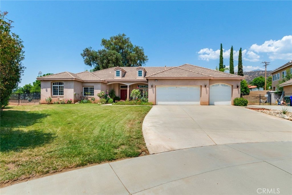 This terrific home in upper Yucaipa is situated on a cul-de-sac and enjoys a near half acre lot with fruit trees, berry bushes and many flowering plants. The home is situated with a large drive way and the lot is fenced and cross fenced. The front porch is inviting with a double door entry with transom window above. This 2435 sf home features 3 bedrooms, an office and large living areas. The interior layout is spacious with separate living and dining areas, glass French doors can provide separation or privacy from the family area. The family room enjoys a fireplace and is open to the center island kitchen. Stainless steel appliances, Corian countertops, a large pantry, breakfast bar and an informal eating area make up a very functional gathering area. The laundry is off of the kitchen making multi tasking easier. The high ceilings and abundance of natural light bring cheer and warmth to the home. The primary suite enjoys a large spa style bath with soaking tub, separate shower, dual sinks and attached is a spacious walk-in closet. A rear patio with an island is great for outdoor fun. Meandering paths through the garden are nicely laid out with butterflies and hummingbirds as your frequent visitors. Fenced separately is a large area that has many possibilities, fruit orchard, sport court, a shop or an ADU. There is plenty of room and locations for a pool as an additional option. This large single story home on .49 of acre has so much to offer and can fit into many lifestyles. Bring your needs, your hopes and dreams and watch the vision come together.