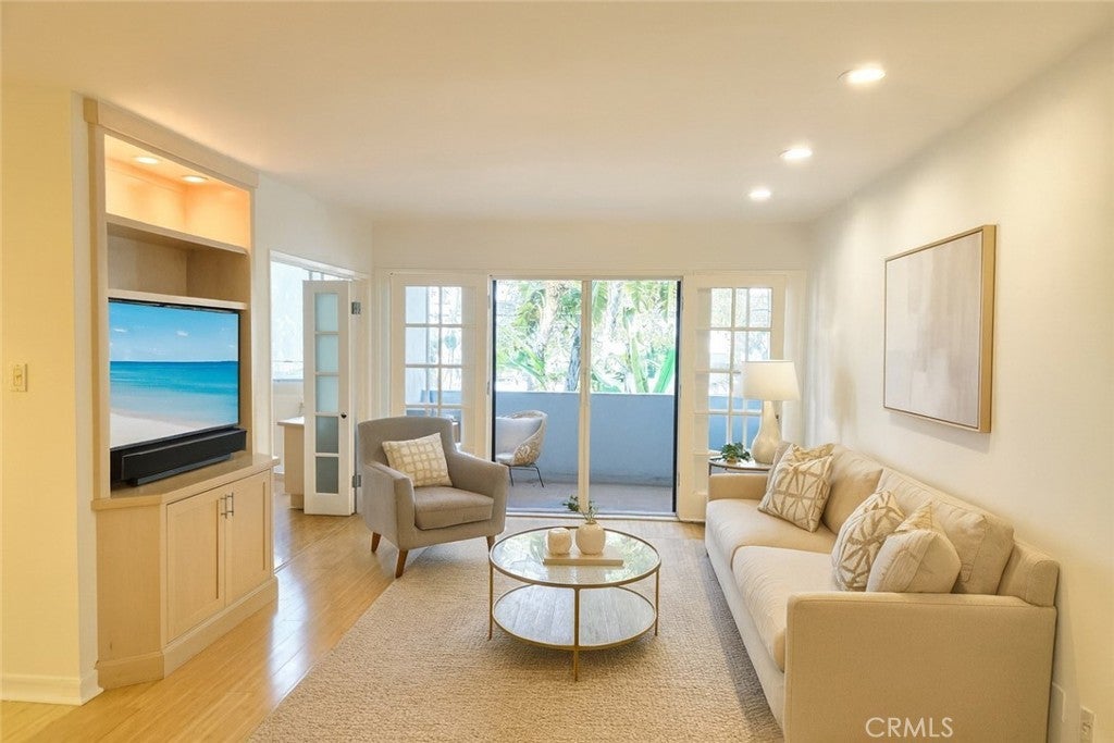 Bright & Modern 2BR + Den | Steps to Montana Avenue | Coastal living in one of Santa Monica's most coveted neighborhoods. This sun-filled condo offers easy access to top-tier dining, shopping, Roosevelt and Lincoln schools. Interior Features: Hardwood floors throughout with fresh carpet in the primary suite. Freshly painted with new dimmable LED lighting. Open-concept kitchen with granite counters, built-in wine fridge, breakfast bar, and stainless appliances flows seamlessly into dining and spacious living areas. French doors open to a generous north-facing balcony with excellent natural light. In-unit laundry. Primary Suite: Walk-in closet, en-suite bath with dual sinks and oversized soaking tub with rain shower. Large 2nd bedroom with oversized closet. Flexible Den approx 13' x 8' could be used as an office, sitting area, or 3rd bedroom. Building Amenities: Two gated parking spaces, bike storage, fitness center, large hot tub, and sauna.