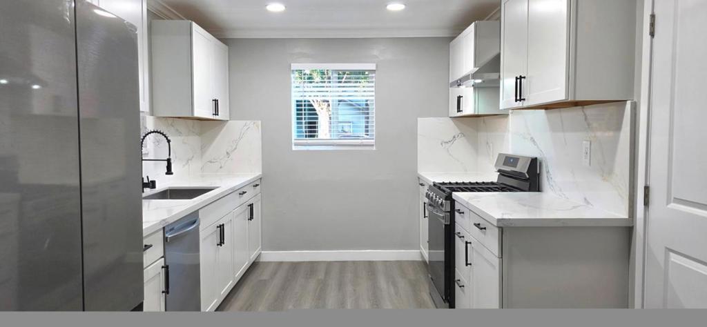 Welcome to this move-in ready single story home. The home is newly renovated with designer two-tone interior & exterior paints, luxurious vinyl planks throughout the house, a well-designed kitchen featuring quartz counters & backsplash, modern Shaker cabinets, Samsung stainless appliances, recessed lights throughout the house with dimmers, with motion sensor switches in hallway and bathrooms. This home also has new doors, hardware and locks, upgraded switches and receptacles along with USB outlets throughout the house, crown molding and baseboards. Upgraded copper pipe plumbing. The living room and the 4 bedrooms have their own cooling/heating system for your comfort and energy saving. Two-inch window blinds are installed for your convenience. There is a 1-car garage and a new concrete driveway which can comfortably fits 3 SUVs. New retaining wall, modern fence and motion sensor lights around the house provide additional curve-appeal and security. Conveniently located near everything.