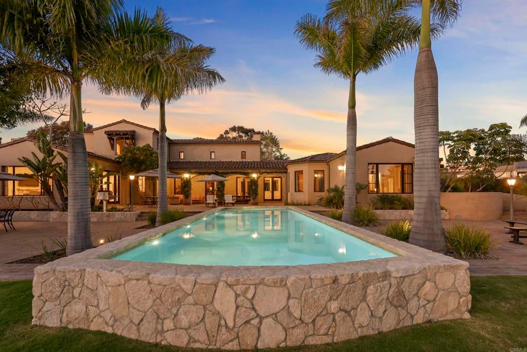 Set behind private gates at the end of a long, tree-lined driveway with a circular motor court, 16733 Calle Hermosa is a one-of-a-kind estate offering resort-style living, timeless architecture, and unrivaled privacy in the Artesian Estates. Surrounded by scenic lemon groves, citrus trees, and mature landscaping, this 3.57-acre retreat blends natural beauty with thoughtfully curated design and modern comforts. Built in 2008 and maintained with meticulous care, the main residence (5,545 SF) exudes quality and warmth. A courtyard entry welcomes you with a fireplace and fountain, while the interiors feature soaring ceilings, oak wood floors, and abundant natural light. The grand great room—with two-story windows, exposed beams, custom lighting, a stunning stone fireplace, and six sets of French doors—anchors the home and flows effortlessly to a covered loggia and the resort-style pool deck beyond. The chef’s kitchen is a dream, complete with a 70" Frigidaire Professional refrigerator, Dacor 6-burner range, double-door ovens, two sinks, dual Fisher & Paykel dishwasher drawers, a walk-in pantry, and breakfast nook—perfect for family meals or entertaining. Just off the kitchen, the inviting family room features a second stone fireplace with a custom designer screen. The main level also includes the spacious primary suite with serene views and a spa-like bath, plus a secondary en-suite bedroom currently used as a home office. Upstairs, two additional en-suite bedrooms offer sizable closets and beautifully appointed baths, creating private havens for family or guests. Complementing the main home is a 918 SF detached guest house with full kitchen, living room, bedroom, and bath—ideal for multigenerational living or visitors. A 529 SF pool house offers a covered loggia for entertaining and includes a secondary garage/storage area beneath - perfect for a home gym, studio, or hobbyist’s space. The outdoor living experience is exceptional. Enjoy a sparkling pool and spa, Cantera stone patios, a covered dining area, outdoor speakers, and wide lawns for recreation. The fenced lot offers tremendous versatility, with room to add a vineyard, tennis or pickleball court, equestrian facilities, or even a collector’s garage. All four water heaters have been recently replaced, and the property is equipped with a fire sprinkler system, septic, Cox high-speed cable, and more. Zoned for both Solana Beach/San Dieguito and Poway Unified School Districts, the location offers flexibility for families and easy access to top public and private schools, freeways, shopping, and coastal destinations. This extraordinary estate delivers the ultimate in Southern California living—a turnkey sanctuary that feels brand new, offering elegance, privacy, and endless opportunity on one of Artesian’s most usable parcels.