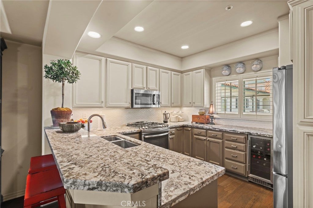 Discover luxury living at Park Regency Villas, where this stunning 2-bedroom, 2.5-bathroom residence offers 1,544 square feet of beautifully appointed living space in an exclusive gated community with secure key fob entry. Positioned on the top floor with no neighbors above, this exceptional unit provides unparalleled privacy and tranquility while showcasing breathtaking views of the Southern California mountains from both of its private balconies—one gracefully extending from the living room and another from the primary bedroom. The home has been meticulously updated throughout, featuring gorgeous newer re engineered wood flooring, soaring vaulted ceilings in every room, and an extensively renovated kitchen with beautiful granite countertops, ceramic tile backsplash, and thoughtfully preserved original cabinetry with rebuilt wet side components and a new refrigerator unit that creates a chef's dream workspace. The property also features an energy-efficient heat pump that's just one year old, ensuring optimal comfort year-round. The luxurious primary bathroom serves as a personal spa retreat with both a full shower and an elegant free-standing tub, while all bathrooms have been completely modernized with premium finishes and contemporary styling. Practical amenities enhance daily living with a dedicated in-unit laundry room featuring updated cabinets, plus an abundance of attic storage space perfect for belongings and seasonal items. Two assigned parking spots in the secure basement garage provide convenient covered parking, while residents enjoy access to the community's amazing courtyard and lush green common areas that create a resort-like atmosphere. This rare combination of luxury updates, prime location, stunning views, and exceptional community amenities makes this Park Regency Villas residence an extraordinary opportunity for sophisticated Southern California living.