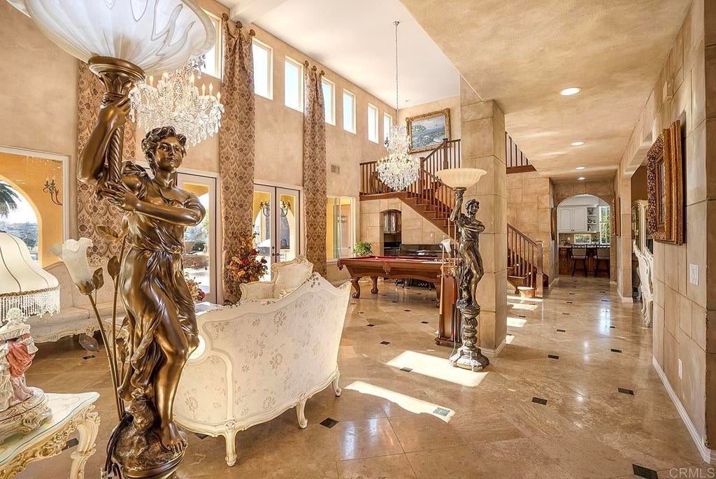 Experience elevated living in this gated Poway estate, where luxury, privacy, and resort-style living come together on 1.76 acres of pristine land. With unobstructed 180-degree views, this breathtaking property offers elegance and exclusivity, making it a masterpiece for those who demand the best. With 5 bedrooms and 4.5 baths, every inch of the 4,689 sq. ft. main residence is designed with grand-scale elegance. Guest Home is 2 bedrooms 1 bath 700 sq. ft., approx. total = 5,389 sq. ft. There is an additional Gym room and also a study room for a total of 9 usable bedrooms. towering ceilings, cascading drapes, seven dazzling crystal chandeliers, and multiple marble fireplaces infuse warmth and sophistication. Custom artisan faux finishes add refinement, enhancing the estate’s distinctive character. At its heart, the chef’s kitchen boasts a sprawling island, high-end appliances, and impeccable craftsmanship, creating the perfect space for both everyday living and grand entertaining. The primary suite is a private retreat with a spa-inspired bathroom, a soaking tub, and an oversized walk-in shower. A built-in office and private gym provide functionality to meet every lifestyle need. A separate 700 sq. ft. guest house expands the estate’s versatility, complete with a full kitchen, private bedroom, full bathroom with in-unit laundry, and office space—perfect for visitors or multi-generational living. Step outside into a private, resort-style oasis designed for entertainment and relaxation. A showstopping 40-foot pool with a built-in jacuzzi takes center stage, surrounded by lush, mature landscaping that creates an intimate escape. For seamless indoor-outdoor entertaining, the estate features two built-in BBQ stations, an elegant gazebo with a stone fireplace, and two custom 9-foot fire tower pits for evenings under the stars. The full-size multi-sport court accommodates tennis, pickleball, basketball, and more, offering endless recreational opportunities. With complete seclusion, this estate provides the ultimate in privacy and exclusivity. The expansive motor court accommodates 15+ vehicles, while the three-car garage with built-in storage ensures convenience and practicality. A rare opportunity in one of Poway’s most prestigious enclaves, this estate must be seen to be fully appreciated