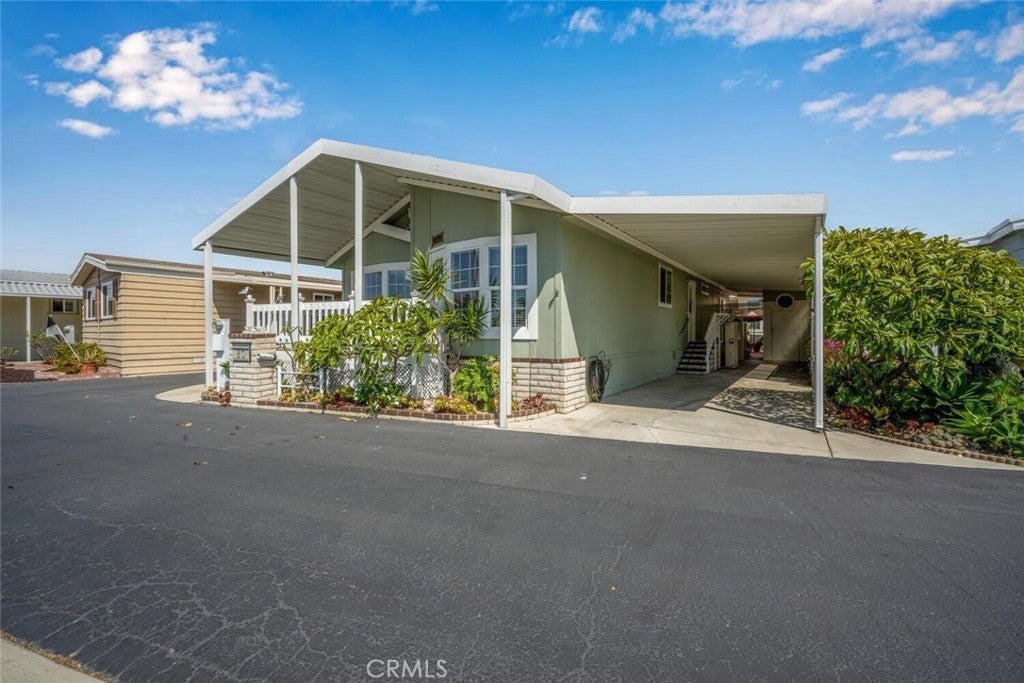 Location Location Location!!! This 55+ Community home is sitting pretty right in the middle of highly desirable Rancho del Rey. Situated right across from the Main Clubhouse making it VERY convenient for enjoying Park amenities such as heated swimming pool and spa, practice putting green right across the street, sauna, guest parking and much more. This 2004 Skyline built home offers a bright and open floorplan with a spacious kitchen that opens to the living room. Other interior features include dual pane windows that provide an amazing amount of natural light and relaxing views. This home is equipped with forced air heating and AC / cooling, tasteful laminate flooring in the kitchen, living room, office and hallway areas, 2 full bathrooms with the master bath offering dual sinks, cabinet storage space for extra towels and linens in addition to a separate soaking tub and shower with safety grab bars in the shower. The spacious master bedroom also offers a large walk-in closet. Rounding out the interior includes all stainless kitchen appliances which include refrigerator, dishwasher, built-in microwave, freestanding gas range and convection oven and last but not least front-loading washer and dryer combo. Exterior notables include a very relaxing and private front porch that overlooks the main clubhouse grounds, attached covered tandem carport that offers an electric wheelchair lift, guest parking right across the street, hard to find backyard area with covered canopy and storage shed. Rancho del Rey Mobile Estates is privately owned and is convenient to shopping, restaurants, freeways, hospitals, sandy beaches, paddle board or kayak in adjacent Huntington Harbour, wetland hiking trails, Main Street Huntington Beach and so much more. Arguably the BEST Value Park HB has to offer hands down.