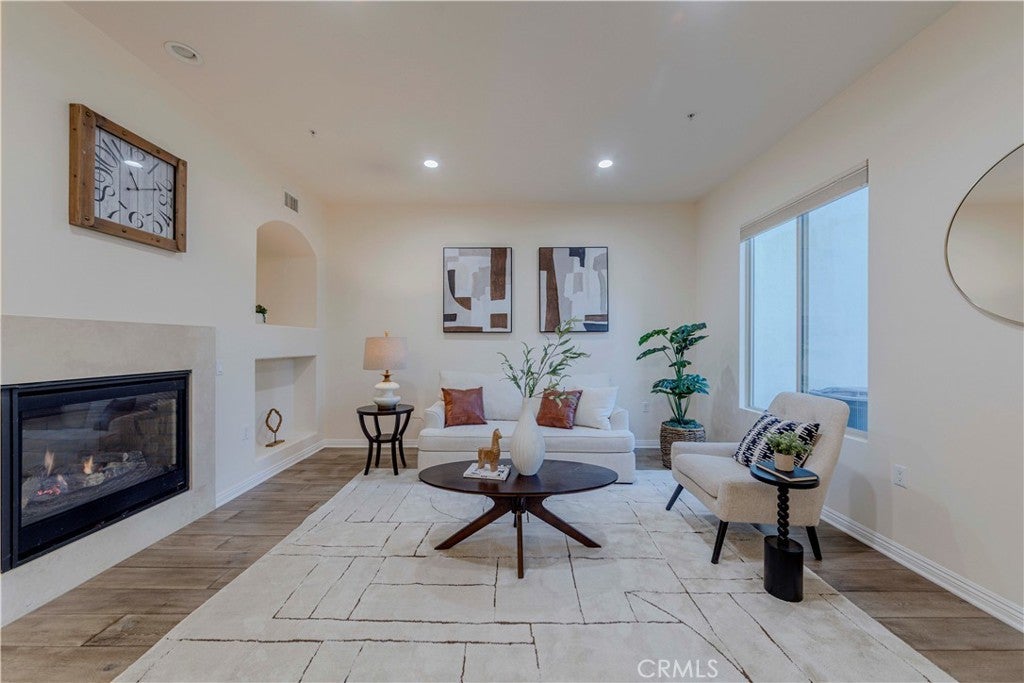 Additional highlights include central A/C and heat, two subterranean parking spaces, and a private, 40 sq ft locked storage room. The charming Mediterranean village ambiance is enhanced by lush landscaping and a secure gated entry.