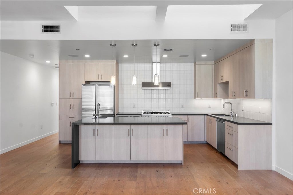 A chef’s kitchen with high-end appliances, built-in wine fridge, and custom cabinetry opens to expansive living space, creating the perfect setting for entertaining and everyday living. Motion-sensor lighting and modern finishes enhance the feel throughout.