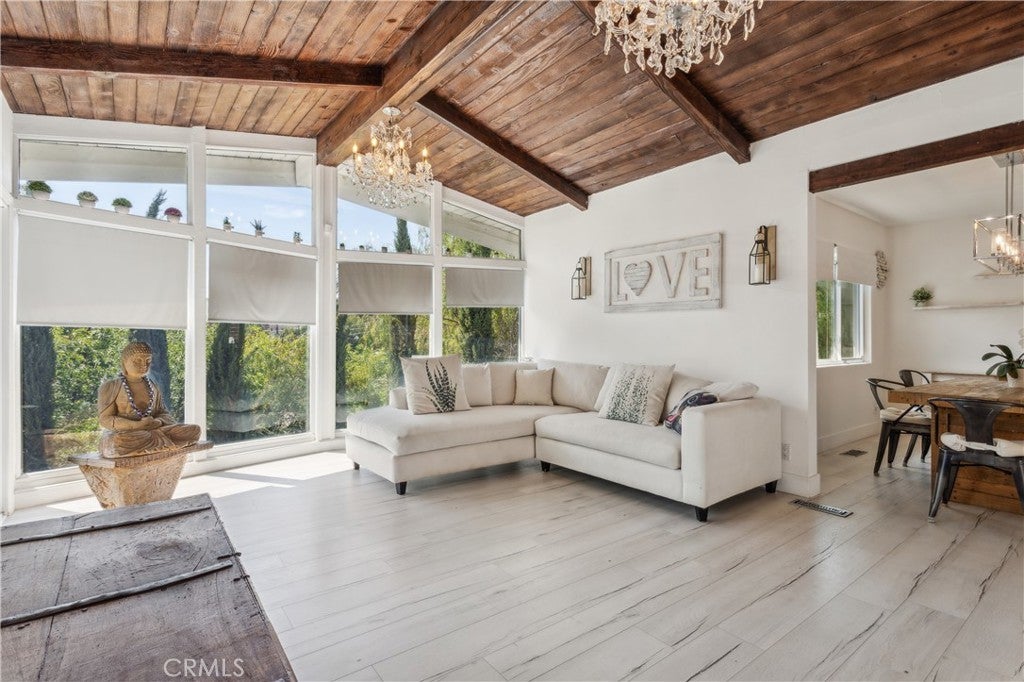 JUST REDUCED. Stunning Mid-Century Gem in Woodland Hills — South of the Boulevard Step into serenity in this gated hillside retreat, perfectly nestled in the lush, peaceful community of Woodland Hills. Surrounded by trees this South of the Boulevard 5 bedroom, 3 bathroom mid-century modern home offers the ideal blend of nature, privacy, and luxury. Behind double stained-glass doors, you'll find soaring beamed ceilings, skylights, white oak floors, and a spacious open-concept layout. The chef’s kitchen is outfitted with a Miele refrigerator, Viking stove, designer backsplash, new countertops, and a large island ideal for entertaining. Each bedroom opens to its own deck with sweeping hillside views, while the backyard features an above-ground pool, multiple lounge areas, and gated parking. Property comes furnished. Recent upgrades include a brand-new HVAC system (2025), new water heater (2024), fully paid solar panels, security system, water softener, and included alarm, gardener, and pool service. Minutes from Trader Joe’s, Whole Foods, The Village, and the Woodland Hills Country Club.