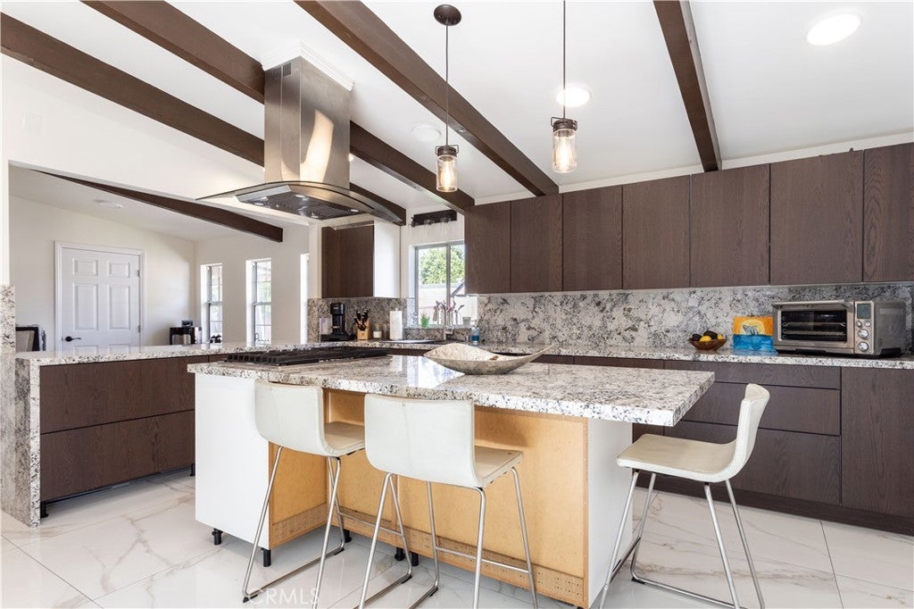 This beautiful Mid-Century home is nestled on a quiet picturesque street in one of Reseda’s most sought-after neighborhoods, and was designed by one of Los Angeles’ most renowned architects, Edward Fickett. Here are just a few of its many other fine features: NEW CUSTOM DESIGNED KITCHEN, NEW MAIN BATHROOM. Mature shade tree, lush landscaping, planters filled with a myriad of rose bushes, and groomed shrubbery you’ll immediately recognize the true “Pride-Of-Ownership” Custom double doors open to a flowing 1,355 square foot open concept floor plan that is in “Move-In-Condition” with HIGH WOOD BEAMED CEILINGS, NEW RECESSED LIGHTING, a designer paint scheme, and the complementary blend of newer laminate and tile flooring. The spacious living room is bathed in natural light from a huge picture window, and complemented by a gas-burning fireplace with custom tiled hearth. Any gourmet cook will truly appreciate the beautifully NEW kitchen’s abundant soft close cabinets, ample granite counters with full back-splash, center island with custom pendant lighting and built-in wrap around breakfast bar, deep basin steel sink with custom faucet, newer built-in stainless-steel appliances, gas cook-top with contemporary glass/stainless steel ventilation hood, plus the convenience of the very large adjoining dining area. A total of 3 bright and spacious bedrooms. 1¾ beautifully appointed bathrooms. Functionally located laundry room. Energy efficient dual pane windows will help keep your utility bills low and the interior very quiet. Central heat & air for year-round comfort. You’re going to appreciate and enjoy the large backyard’s tall privacy fencing, patio, and the 2 very handy storage sheds. Plenty of secure off street parking for all of your vehicles and other toys on the oversized concrete driveway and under the large carport. All of this sits on a large 7,500 square foot lot that’s within walking distance of Melvin Elementary School, and minutes away from the Orange Line Busway, Pierce College, Topanga Mall, The Village at Topanga, and Warner center with its entertainment and myriad of gourmet restaurants.
