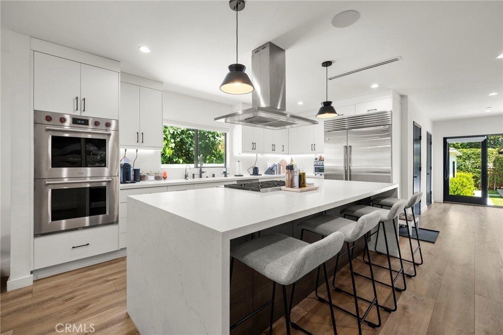 Stunning home in Woodland Hills, 3 Bedrooms and 2.5 Baths renovated recently with extraordinary attention to every detail. Nothing has gone unnoticed. Kitchen includes custom cabinetry and lighting with a subzero refrigerator, wolf cooktop and wall ovens, a large island and a walk in-pantry. Primary Bedroom includes a walk-in closet, designer bathroom with natural stone finishes, large double vanity, and expansive shower, complete with waterfall and handheld showerheads. Direct access to the backyard from both the primary suite and the family room leads you into a dream backyard, complete with an expansive outdoor kitchen with a bar and dining area perched beneath a modern metal pergola, providing full coverage. Outdoor kitchen includes a built-in BBQ, sink, and more! The outdoor entertaining continues off the outdoor bar with a custom built conversation area and firepit with ample room for plenty of guests! Off the backyard, the garage has been converted to a home office and plans are complete for a conversion into an ADU. Additional features include a laundry room large enough for side by side washer and dryer, home alarm system, Tesla charger, interior fire sprinklers, newer cool roof, tankless heater and security cameras. Every comfort has been addressed in this home that has been designed for maximum comfort throughout.