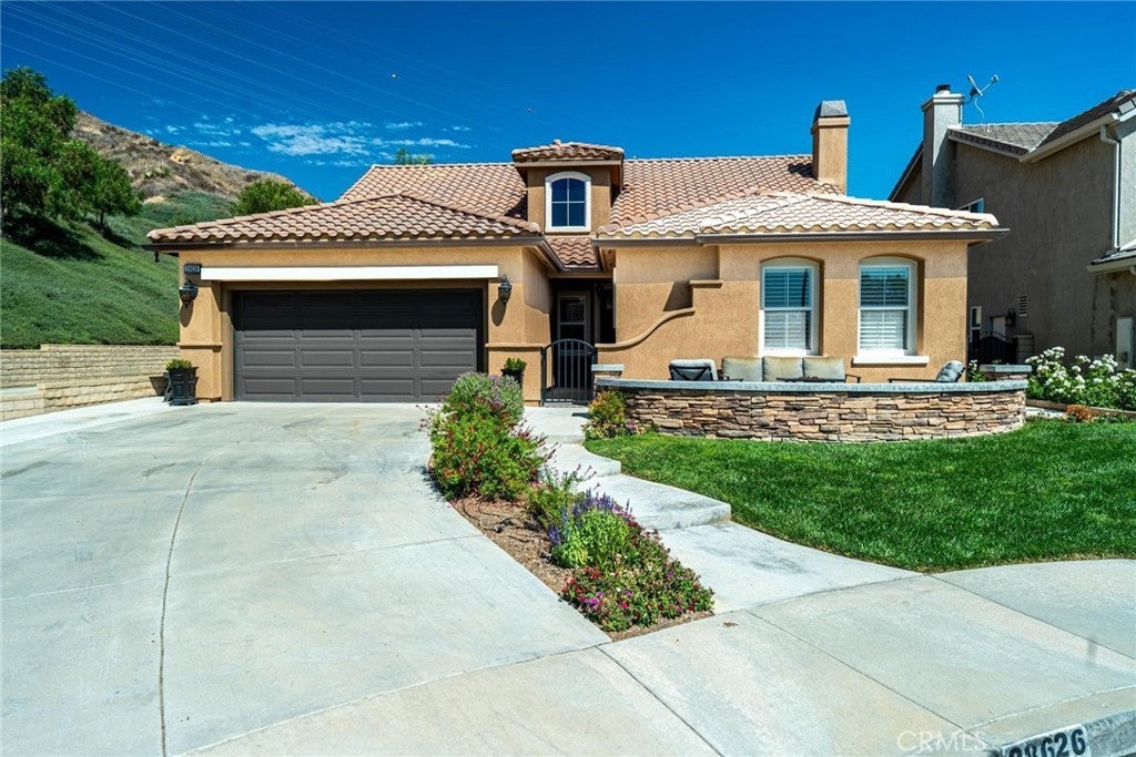 Can’t find a large single story? This popular floorplan has the primary suite PLUS two more bedrooms downstairs! Full bedroom and bathroom upstairs plus a spacious loft. Terric versatility and rarely for sale. This absolutely gorgeous pool home is located at the end of the cul-de-sac. The kitchen is breathtaking. It was remodeled in 2024 with outstanding meticulous finishes. Greige custom cabinetry with 4 ft doors, black hardware, all soft close drawers, island with built-in microwave and pull-out cabinets, quartz countertops, ceramic 3x12 horizontal backsplash and Café appliances. Custom pantry with pull-out drawers. Laminate “white oak” looking floors throughout with 6-inch baseboards. Family room fireplace was redone with new custom doors and tiled fireplace. The primary suite bathroom was also remodeled in 2024 with a custom dual vanity, quartz countertops and a beautiful walk-in shower featuring hexagon white tile flooring and 3x12 tile walls. Primary suite added French doors off the back leading to the covered patio. The other two bedrooms downstairs are also good-sized and share another bathroom which has been remodeled with a custom vanity, mirror and lighting. Linen closet has been added for additional storage right outside the bathroom. Formal living room has a fireplace with custom doors, newer mantel and trendy sconces. Upstairs loft is large and would make a great game room or second family room. Bedroom upstairs is currently set up as an office but has a closet which makes it the 4th bedroom in the house. Entertainers’ backyard! Outdoor island with BBQ, covered patio, pool and spa, and turf! Extra-long and wide driveway with a 3-car garage. No Mello Roos. This home is a 10!!