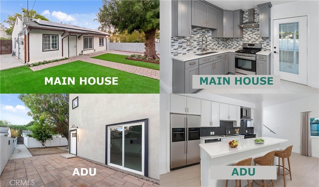 A rare opportunity with a BRAND-NEW, FULLY PERMITTED ADU built in 2025 and SOLAR PANELS on both the main home and the ADU. A TOTAL 5 BEDROOMS AND 4.5 BATHROOMS! Perfect for rental income, multigenerational living, or guest housing, this property combines functionality, efficiency and privacy in one turnkey package. The updated main house offers 3 bedrooms and 2 bathrooms with modern curb appeal that includes contemporary fencing, a gated driveway, artificial lawn, paver walkway and driveway, colorful landscaping, a covered porch, mature shade tree and rain gutters. Inside, you’ll find fresh paint, newer dual pane windows, 6-panel doors, a high-efficiency HVAC system with mini split A/C and a tankless water heater. The family room features a pitched ceiling, tile floors and modern lighting. The kitchen includes quartz countertops, ceiling-height cabinetry, mosaic tile backsplash, soft-close drawers and doors, a stainless 5-burner gas range with hood, stainless undermount sink and a French door that opens to the backyard. The dining area flows easily from the kitchen. The primary suite features luxury vinyl flooring, and an en suite bathroom with a custom glass-enclosed tiled shower. Two guest bedrooms and a remodeled guest bathroom with a frameless glass shower complete the layout. The backyard offers a covered patio with ceiling fan, fruit and shade trees and vinyl fencing. The NEW ADU features 2 bedrooms and 2.5 bathrooms with its own private front and back yards and separate entry. The open floor plan includes recessed lighting, natural light, tile floors and a stylish kitchen with quartz counters, ceiling-height cabinetry, full custom tile backsplash, Samsung® induction range, dishwasher, stainless undermount sink, pull-down faucet and island with breakfast bar. There are TWO PRIVATE PRIMARY SUITES, each with its own bathroom—one with a tub/shower combo and the other with a glass step-in shower. A powder room, laundry area, frameless glass stair panels, dual pane windows, 6-panel doors, separate water meter and a multizone high-efficiency heat pump add convenience and value. Located minutes from shopping, dining and freeway access, this property checks boxes for flexibility, efficiency and long-term appeal.
