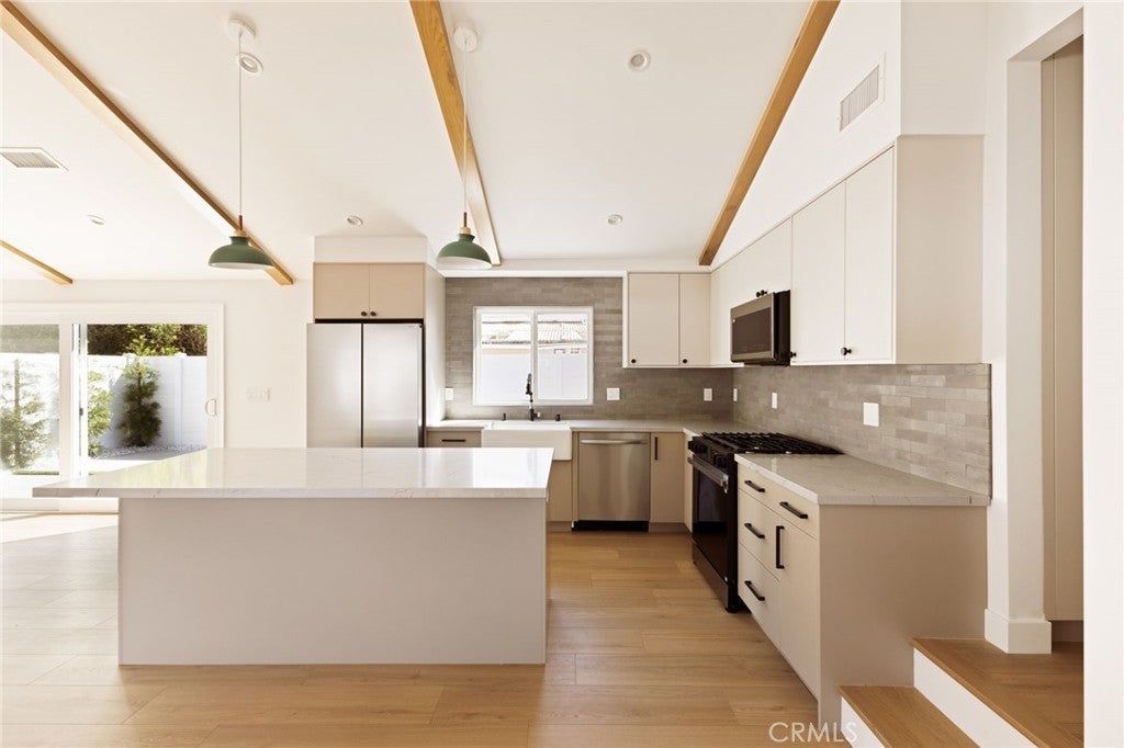 Welcome to this luxurious, newly remodeled, one story home ideally located in the heart of Woodland Hills, Walnut Acres adjacent, just north of Ventura Boulevard. Perfectly situated on charming residential Street, the stunning residence blends, modern elegance with every day comfort. Inside, you’ll find vaulted ceilings, accented with beautiful wood beans that add a touch of architectural drama to the spacious kitchen, complete with custom cabinetry, sleek countertops, stainless steel appliances, and ample storage. Elegant would like laminate flooring flows throughout, complementing, the stylish design, and open layout. Both Designer bathrooms feature high end finishes – one showcasing, a walk-in shower and the other a tub shower combination – providing a spa – like atmosphere. A convenient washer and dryer are also included for added ease. The flexible layout offers the option of a 4th bedroom or office, ideal for work, guests, or your personal needs. Step outside to your private backyard oasis with a patio area, ideal for entertaining or unwinding beneath the stars. The low maintenance landscaping with artificial turf, enhances curb appeal while keeping water bills low. This exceptional home offers the perfect blend of luxury and location, just moments from Westfield Mall & Village, Calabasas Commons, Warner Center, top rated shopping, dining, and entertainment to also include being close to the 101 freeway. Available now for immediate occupancy – a truly refined living experience awaits in one of Woodland Hills most sought after neighborhoods.