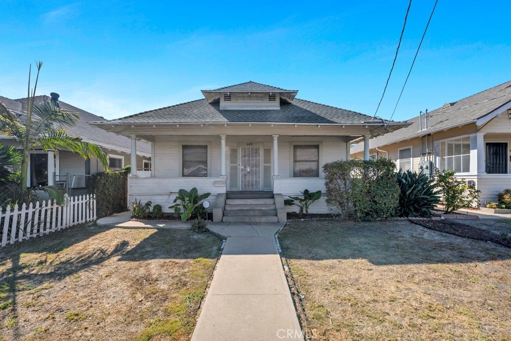 This quintessential 1911 Craftsman-style bungalow captures the spirit of early 20th-century architecture with its timeless design and inviting character. Featuring 2 bedrooms, 1.5 baths, and approximately 1,260 sq ft of living space, this home sits in a desirable San Pedro neighborhood known for its historic charm and convenient location. Original details, like wood siding, statement window casements and door jambs, decorative picture rails, and a stained-glass front door, evoke the warmth of its era, while thoughtful updates provide a comfortable blend of old and new. A covered front porch sets the tone for relaxed coastal living. The entryway offers period hardwood floors that flow throughout. The cozy living room features a brick fireplace, built-in storage, and a convenient passthrough to the kitchen. The updated eat-in kitchen showcases quartz counters, white shaker cabinets, wainscotting, and ample space for informal dining. Just off the kitchen, a utility room with laundry hookups and a half bath adds function and flexibility. Both bedrooms are generously sized with walk-in closets and share an updated Jack & Jill bath complete with quartz counters, tile flooring, and a classic tile surround. Out back, enjoy a spacious brick patio with a covered area ideal for entertaining or relaxing in privacy. A detached two-car garage with alley access offers parking and storage, or the potential to convert into a private ADU. This rare early-20th century gem offers the opportunity to embrace San Pedro’s historic character while customizing it to suit modern living, close to the harbor, freeways, and the exciting West Harbor waterfront development, with its future mix of dining, retail, and entertainment. A true blend of charm, potential, and location. Don’t miss out!