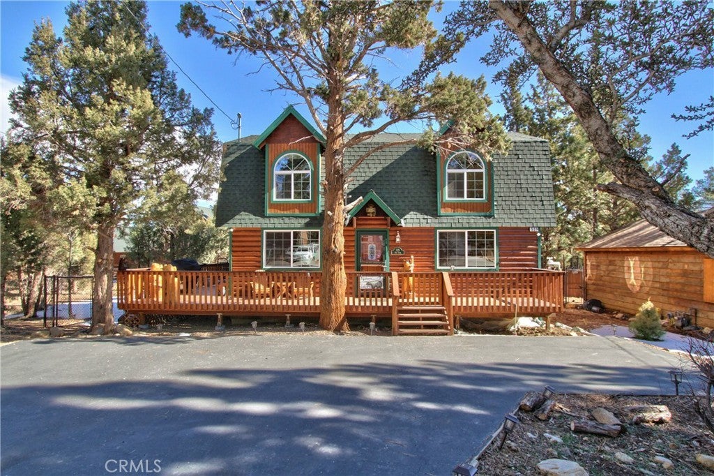 Beautiful log style home located in a quiet setting on the eastern edge of Sugarloaf backing up to Meadowbrook Estates. This property sits back from the street on a 4,500 sf level lot with a paved driveway, 3 bedrooms, 2 baths and over 1300 sq ft of living space. Enjoy the outdoors on the extra large wrap around deck u under the mountain air. Warm mountain feel throughout with a cozy river rock fireplace, exposed beam ceiling and pine cabinetry and accents. Large open floorpan and a laundry area. Tuff shed in back for storage. All necessary appliances will convey. Near national forest and everything Big Bear has to offer. Walking distance to Baldwin Elementary school and Big Bear High.